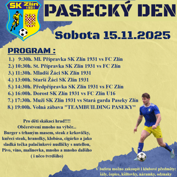 Přijďte si námi v sobotu 15.11.2025 od 9:00h. užít svátek fotbalu na Pasekách. Budou se na Vás těšit všechny naše kategorie od nejmladších fotbalistů, až po finále, kdy nastoupí tým mužů proti staré gardě Pasek. Bude pro Vás po celý den připravené bohaté občerstvení , k zakoupení klubové předměty a pro děti k dispozici i skákací hrad!!! Těšíme se na Vás....