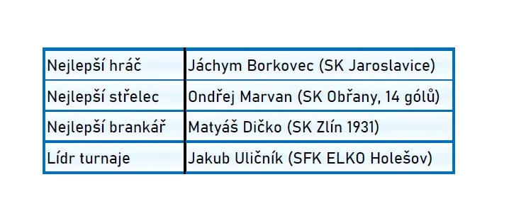 Dále byly předány individuální ceny, a to pro nejlepšího hráče (Jáchym Borkovec, Jaroslavice), nejlepšího střelce (Ondra Marvan, Obřany), nejlepšího brankáře (Maty Dičko, SK Zlín) a premiérově byla předána zvláštní cena pro top lídra týmu/turnaje (Jakub Uličník, Holešov). Pochvalu ale určitě zaslouží všechny týmy a hráči bez ohledu na pořadí a výsledky.